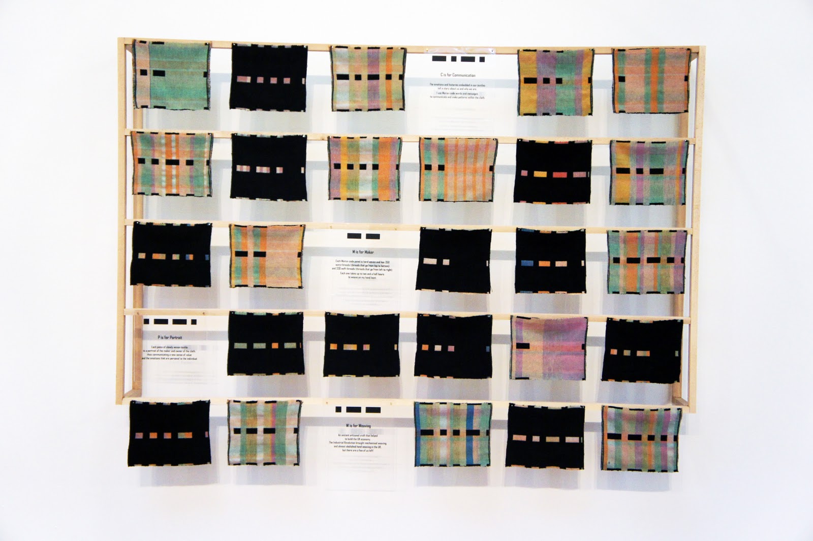 I have now unveiled my hand woven Morse-code Alphabet at Portraits In The Making, a new exhibition at PM Gallery & House in Ealing for the London Design Festival.  I have been making my alphabet all summer, my aim is for it to provoke an emotional response to textiles, the history, love, stories and memories embedded in them, in this case quite literally with lettering. This is a coded technique I use throughout my weaving work to communicate a sense of identity and value.